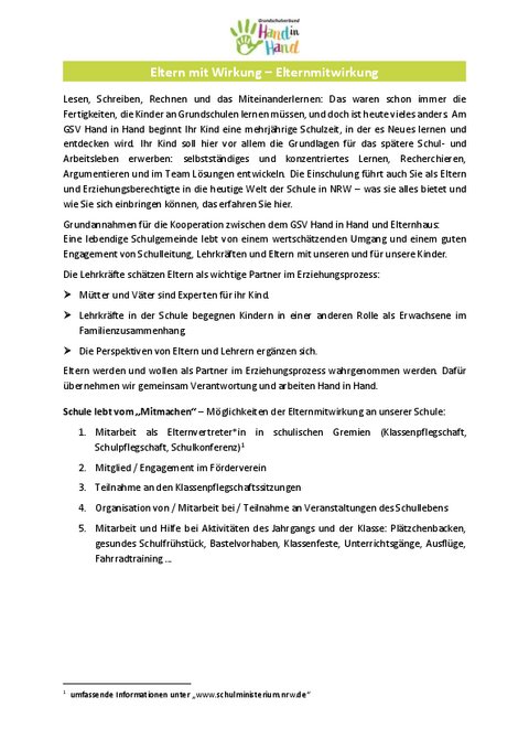 Grundannahmen für die Kooperation zwischen dem GSV Hand in Hand und Elternhaus: